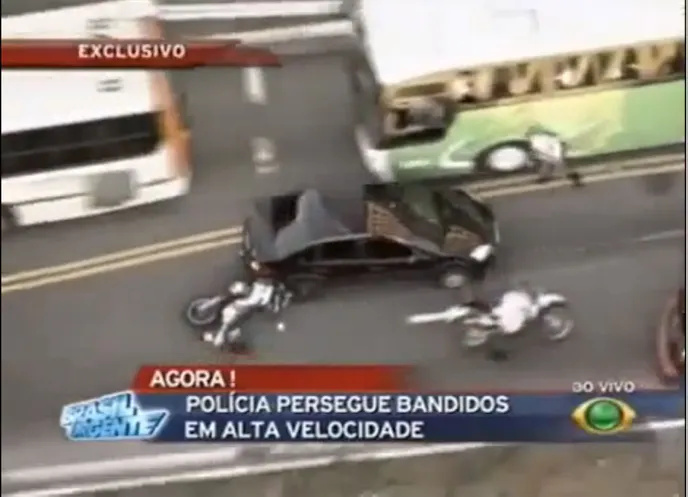 Real life car chases that we see on the news are like the train wreck we can’t look away from. Unfortunately, we don’t speak Portuguese, but in this case the video is enough to know that what we’re witnessing is one heck of a car chase, of course filmed live at the time via an overhead helicopter and reported on by the hysterical anchors from the local news outlet. At first glance, it appears as if he might get away before he gets hemmed in by the bus and the traffic stopped in front of him. Like most criminals (and we’re not real sure why he was being chased) he then escalates the problem by attempting to kill a couple of motorcycle-riding cops in the process of making his exit.