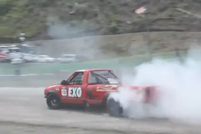Fast forward to the present day, we see an S-10 Chevy pickup truck pulling to the line. Before it is time to race, he rips off a 360. Then he pulls another one just for good measure. What’s not too like?