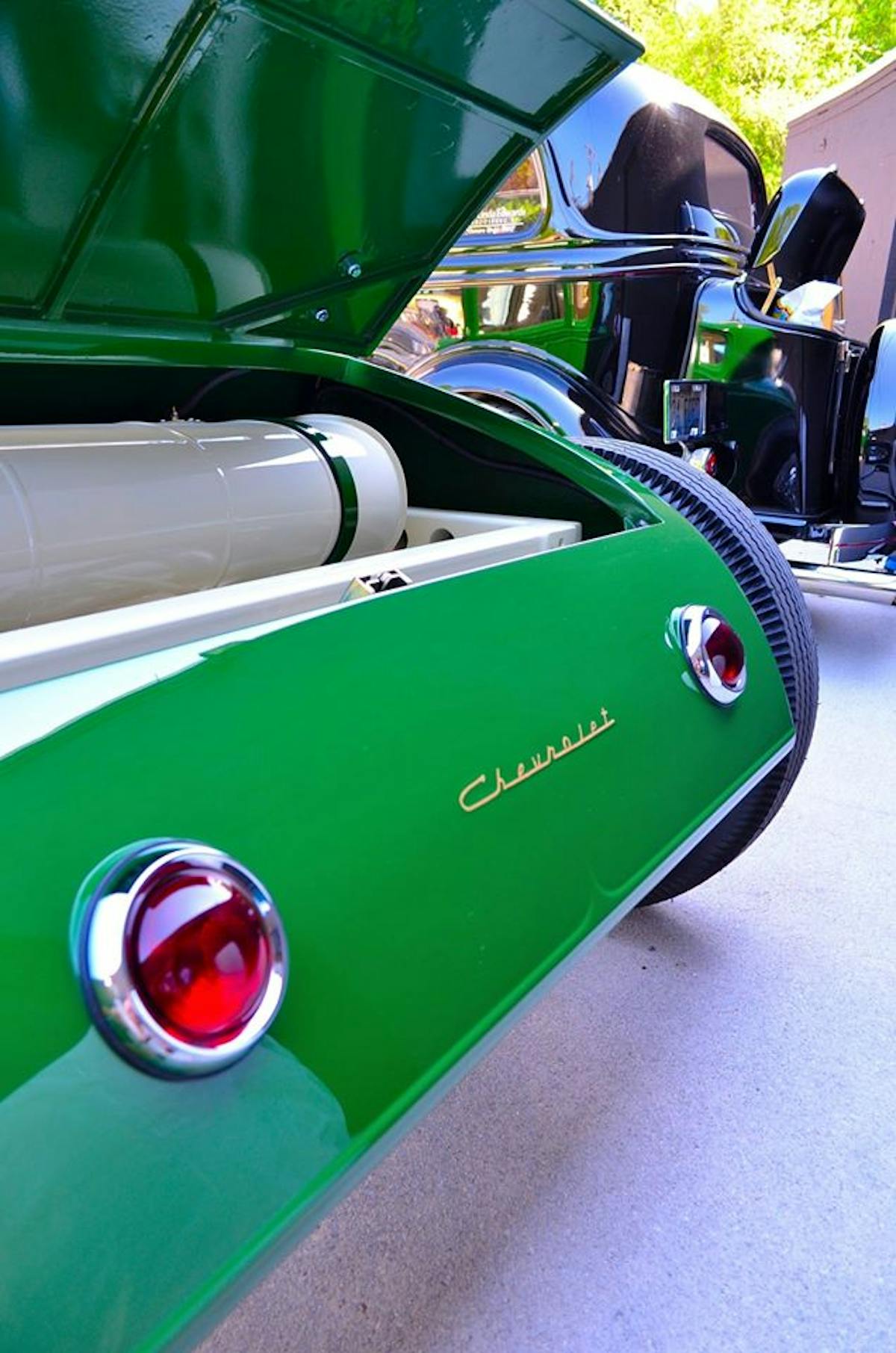 Finished in Quaker State Green, an old 1950s fleet truck color, the hot rod really pops with its white frame. Following suit, the interior incorporates both the white and green color schemes for a classic finish.