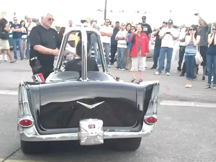 Even crazier, this behemoth engine sits only inches away from an open cockpit. With fire spitting from it’s pipes and its window shattering cackling, this mighty trike wowed the crowed at what appears to be a motorcycle rally. We believe this hot rodding monster deserves a mention amongst the Great Wonders of the World, giving competition to the Great Pyramids and the Great Wall.