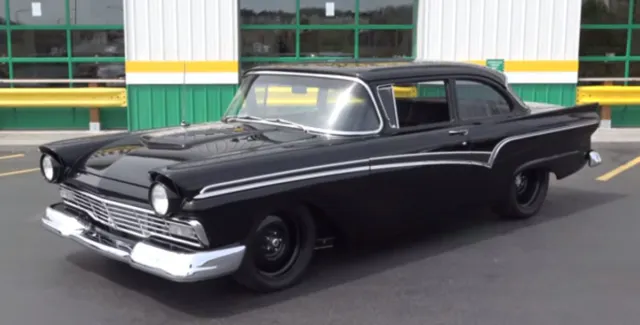 John Jennings is the proud owner of this black beauty in the video above and is a long time Ford enthusiast. It’s filled with subtle touches, from the hood scoop grafted from a 1961 Thunderbird, the bench seat that flawlessly imitates custom bucket seats, to the immaculately leather trimmed trunk. John chose 17×7 and 17×9 aluminum wheels and then coated them black to simulate “steelies”.