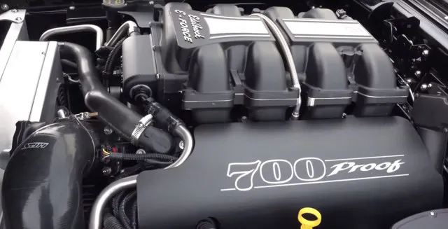 The long flowing trim down the side is normally gold in the center, but John chose to black out the center keeping with the moonshine runner theme. He chose the 3-valve motor because it responds to supercharging better than the 4-valve motor. He backed it up with a 4R70W transmission controlled by a Powertrain Control Solutions control module spinning a 9-inch Ford rearend.