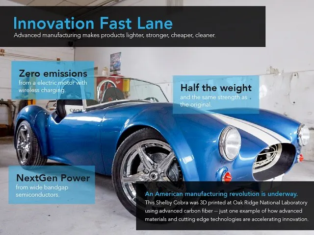 President Obama and Uncle Joe Biden stopped by to have a look at this exciting new tech with our VP saying “It’s no Corvette…” Maybe not now but this printed Cobra is darn close to the real deal and evolving as you read this. The long gone Owens Corning workers building fiberglass Corvette bodies 60 years ago would be fascinated to see how their embryonic technology has evolved.