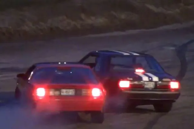 The race took place at Beech Ridge Motor Speedway in a drag race between spectators. The two finalists, as it turns out, both represented the best of the 1980’s with the Pontiac Trans Am and Fox-body Mustang. It was supposed to be a best-of-three drag race right in front of the grandstands, but as the video shows, that isn’t quite what happened.