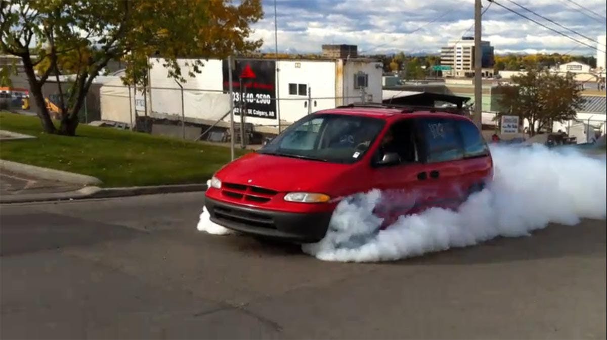 We’ve seen burnouts, and then we’ve seen burnouts. It takes a moment for the engine to spool up to full boost (and we’re amazed the brakes hold it back!) but the noise this machine makes while doing so is music to a turbo lover’s ears. Taking notice of the three-gauge pod stock on the driver’s A-pillar, we can only assume that more than a couple of bucks have been put into this thing, and according to the comments on the video, the minivan is for sale for $10K.
