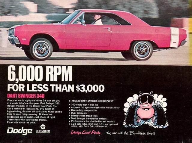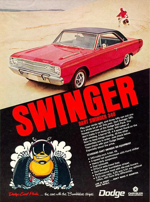 When speaking on the little Dodge he’d say things such as, “Dodge has launched another torpedo at the fickle heart of the American youth buyer, ” and “Like the Super Bee it’s aimed at the inexpensive side of the performance market. Whoever tossed this idea into the suggestion box should be much fatter and richer now.”