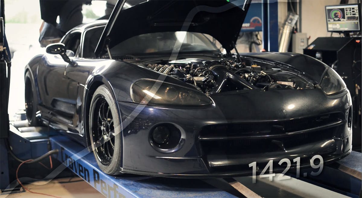 You get to watch the whole process from multiple angles as Reed sneaks up on the tuneup, making a succession of pulls until he sees the number he wants on the screen – an absolutely insane 1,421.9 horsepower at the wheels. The car was built by the Viper wizards at JMB Performance and dynoed at Craven Performance; just watching made our Monday a whole lot better. Check out the video and enjoy!