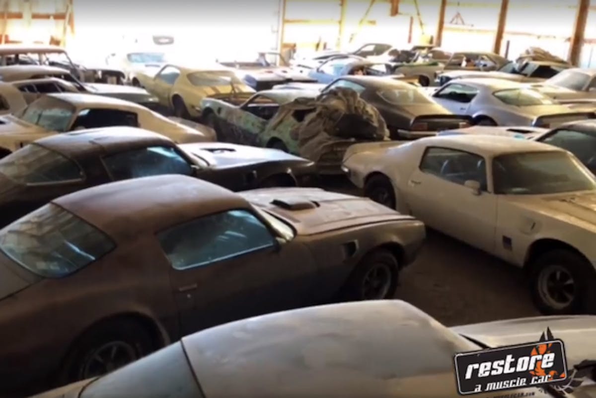 However, this barn find is more like a “forgotten-warehouse-find” based on the size of the building and the fact that there appears to be something in the neighborhood of 30 Pontiac Firebirds in various conditions and ages (we’re pretty sure there’s a third-gen in the right-hand corner nearest the door) along with a wagon of some sort (left side, near the door – we can’t really make out the taillights).