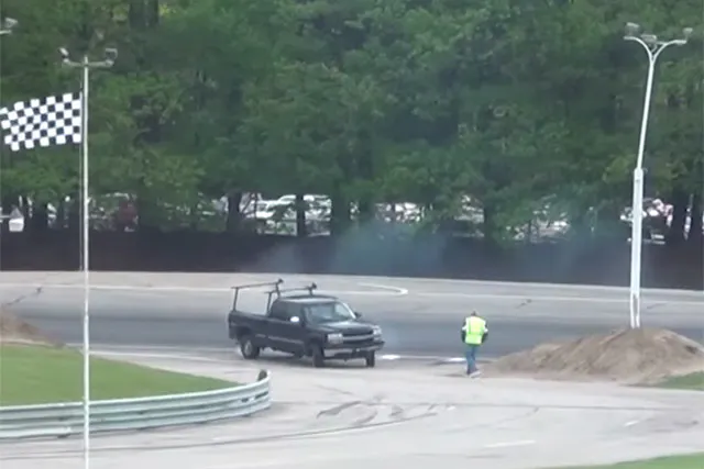 Call it whatever you want, the bottom line is that this guy is straight-up throwing rooster tails of tire smoke around the oval in what appears to be a completely stock pickup truck – aside from the aftermarket ladder rack for additional street cred, of course. And that’s nothing to say of this man’s sheer tenacity, as we see him stay in the throttle after smacking the tire wall and spinning (blowing out one of the front tires in the process) and maintaining what appears to be no concern whatsoever for the potential damage to the truck or his person.