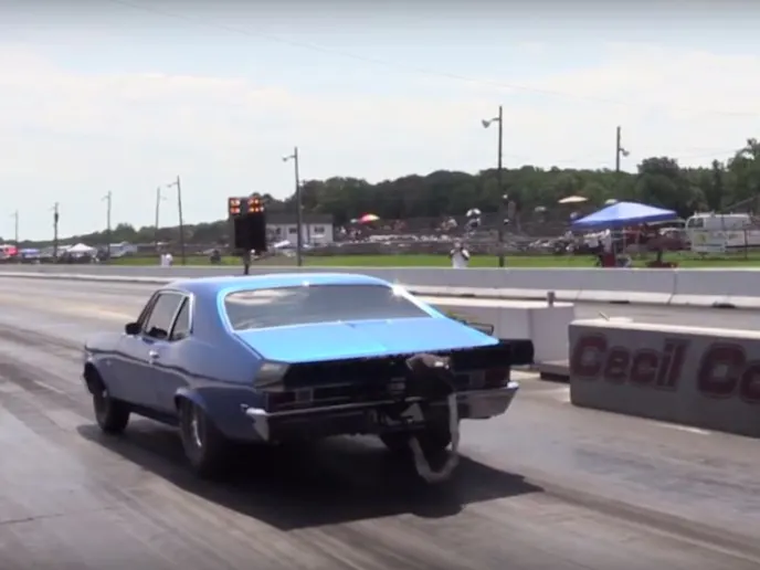 Nicknamed PetroNova this nitrous Chevy Nova drag car was spotted by YouTuber BigKleib34 racing at the Cecil County’s Street Car Shootout. He captured two of this Nova’s passes.