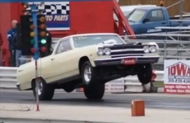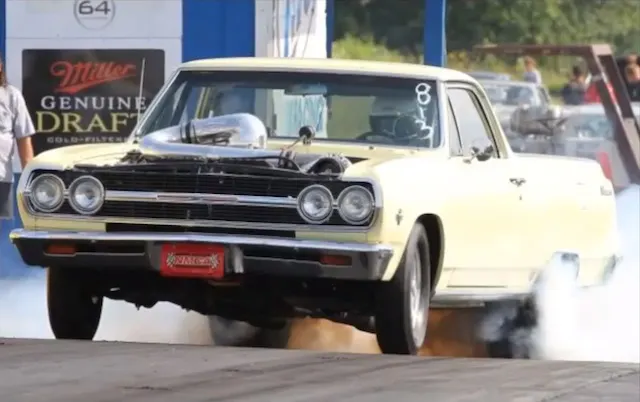 Fritchie’s El Camino is apparently street legal and is never towed to the track on a trailer, though from its performance at the strip one would expect the fast ’65 to be towed behind a race team-sponsored semi, especially in light of the crazy wheelstands that Wayne’s 8-second street Elk pulls in our featured clip.