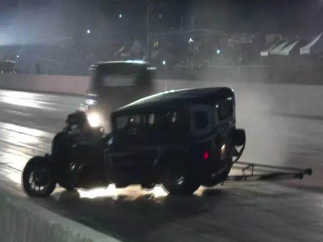 Shortly after the 60-ft, the ’26 gets a little loose, which leads to sideways, and then the car veers out of its lane crossing in front of the truck. The driver of the truck does his best to navigate his vehicle down the track while avoiding the careening Ford. Throughout the craziness, it appears that the ’26 might tip over and roll, but fortunately the driver did his best to keep the wild car under control.