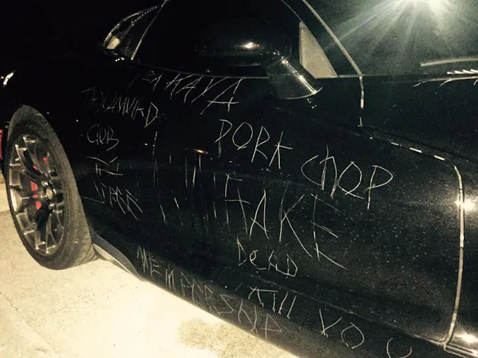 The vandalism wasn’t limited to a scratch or two, it was an entire vehicle’s worth of paint work needing to be done. After getting estimates, his $120,000+ car received and estimate of roughly $34,000 to fix the damage that was done. There literally isn’t a panel that wasn’t violated by this wanna be artist, and amongst the graphics were odd text scribbling that didn’t seem to make much sense. The gouges were deep enough to destroy the some panels.