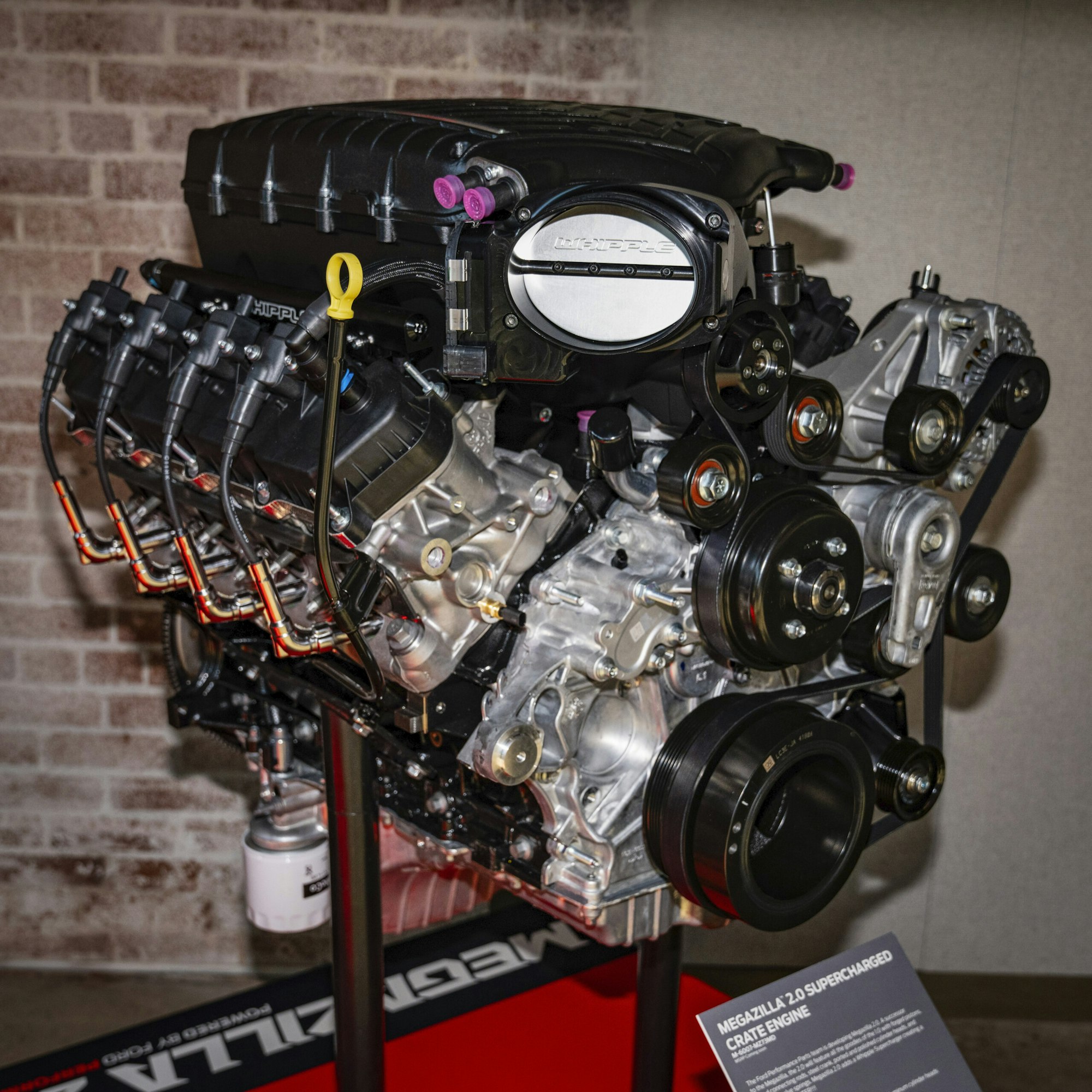 In the other corner is the newest old-school monster from Dearborn. The 7.3-liter Megazilla 2.0 has no fancy overhead cams, but it does come with ported and polished heads, upgraded valve springs, and forged pistons and connecting rods. Topping it is a Gen-6 3-liter Whipple supercharger. Ford projects it will make over 1,000 horsepower.