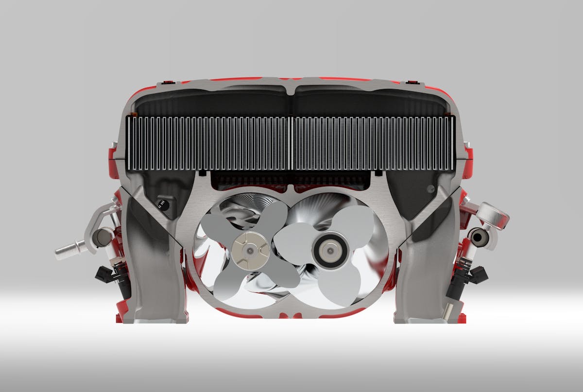 - The inverted design allows for an oversized intercooler, each core is 2.125” thick, dual-pass = 4.25” thick core