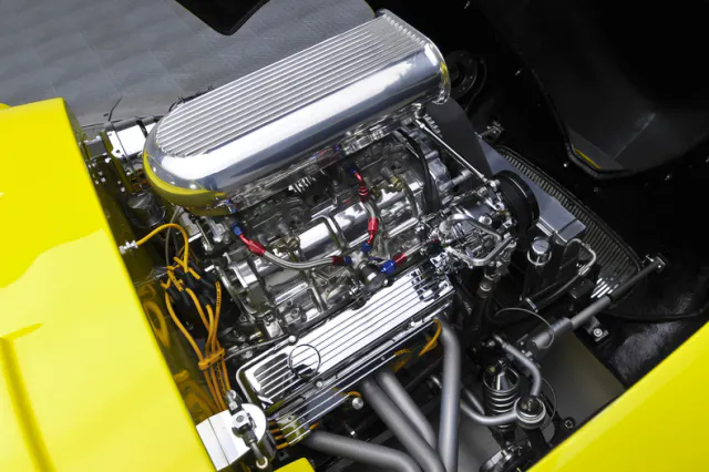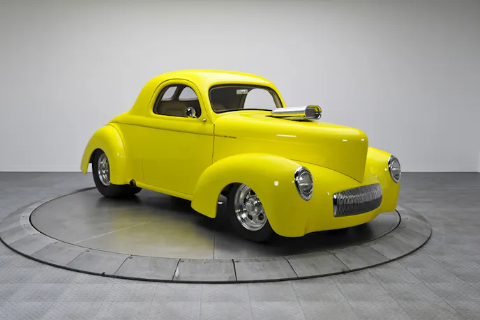 RK Motors Charlotte has worked diligently to become “a destination for serious collectors from all over the world,” and has seen their fair share of Willys Americars. This particular one isn’t your typical Americar though. The 355 cubic inch V8 engine is just a notch on the list of non-Americar aspects. Add the Weiand blower to bump the output to 560 horsepower, a 700R4 4-speed automatic with a 2,800 stall converter definitely expand the list further. The icing on the proverbial cake though is the mandrel bent Bad Boys Willys chassis and the high end fiberglass body. “Okay, so it’s not really an Americar,” admits RK Motors, “and naturally, that paint isn’t a traditional single-stage that’s going to dull and wash off in four years. Instead, this Willys is a high quality fiberglass tribute that’s been prepped, dipped in R-M Diamont Yellow and finished to a much higher standard than anything that rolled off a pre-war assembly line.”
