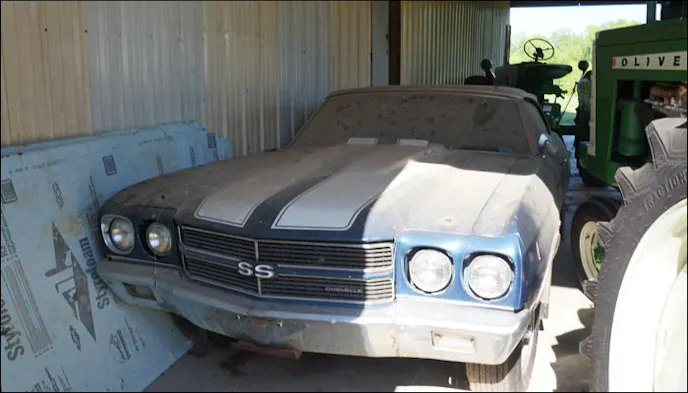 These pics from CarsinBarns.com may not look like much but we can see that they are definitely of a 1970 Chevelle SS convertible. And it sure seems like it is sitting in a barn, with all of those tractors parked around.