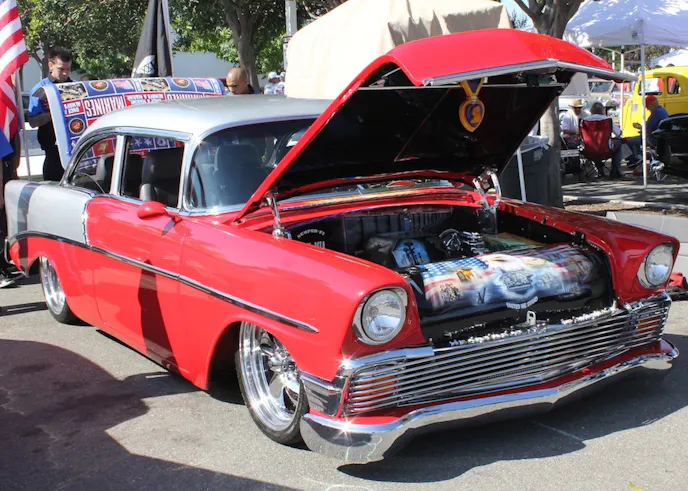 West Covina’s Lloyd Johnson has the ultimate military tribute car. While the sedan is ultra clean and pretty stock, it’s the paint and the detail that set it apart. We’ve never seen an engine this detailed with murals… or as clean.