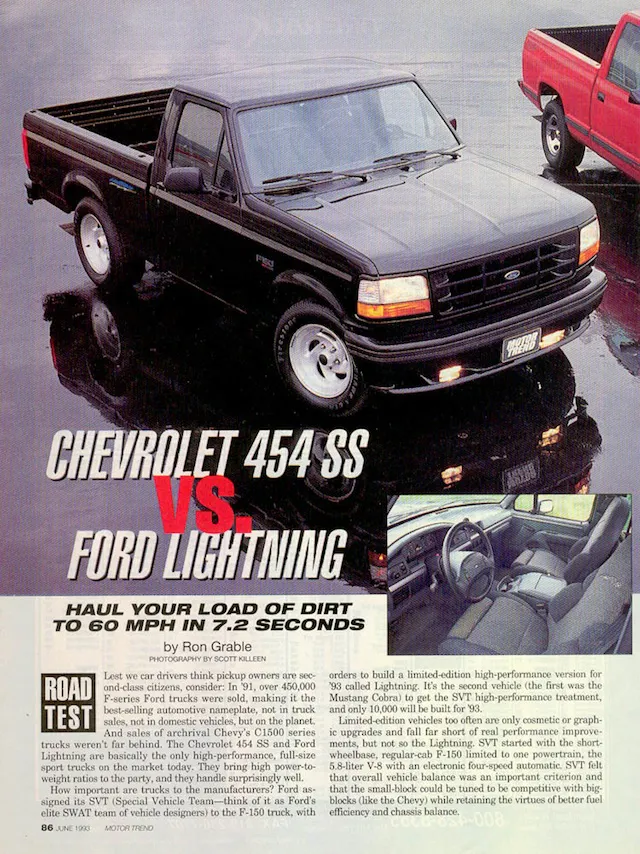 Coupled with enhanced suspension for better handling at higher speeds, SVT’s modifications to the F-150 Lightning made for a sport truck that cranked some 240 horses with 340 feet-pounds of twist. This was nearly equal to the Syclone’s 280 horsepower with 360 torque, and it was enough to equal Chevy’s 1500-based, 454 SS in straight line performance.