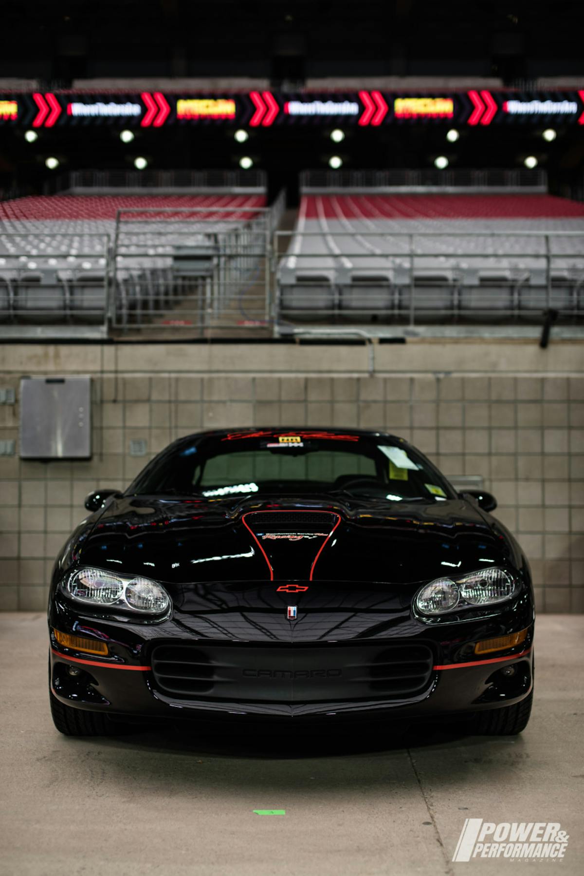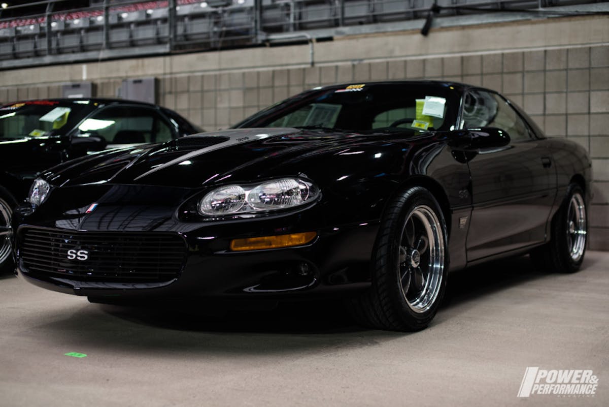 This Camaro is powered by a 5.7L LS1 V-8 engine hooked to a 6-speed manual transmission with chambered exhaust, custom wheel and tire package, plus it is seen with an Onyx Black exterior with Black Intimidator SS interior.