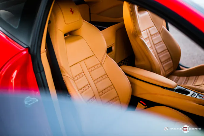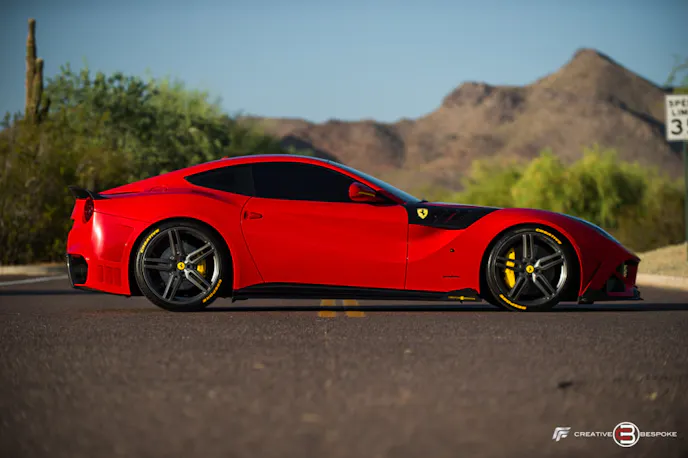 The edgiest thing on this stallion has to be the carbon fiber replacement fender trim. The F12 has a very exotic hood and fender line that sweeps from the rear of the hood and down in the back of the front fender that follows all the way up to the door handle.