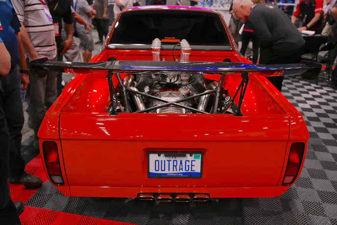 Mike’s chassis choice for Outrage also helped when his team laid out the body. “We were four-inches outside the wheel well after I had custom wheels made to the maximum backspace possible. It’s got 275/35R18s in the front on 10-inch wheels with 5-3/4-inches of backspacing, and the rears are 18×11 with 315/30R18s – all BF Goodrich Rival 1.5’s. But, it has 8-1/4-inches of backspacing on the rear wheel. I worked with the folks at Forgeline, and they custom made those wheels to my dimensions.”