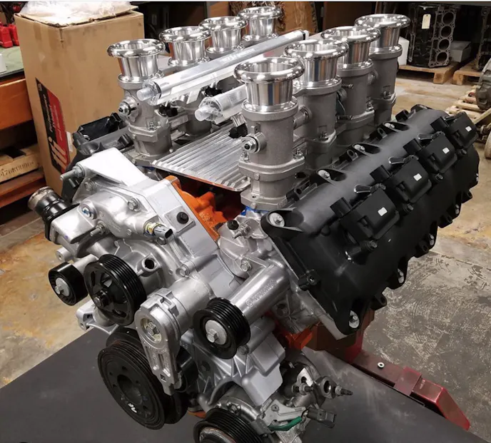 “It’s a mid-engine car now. It’s got a Gen-III Arrington Hemi in it. That includes our CNC Ported heads and camshaft. When people ask, ‘what’s the cam?’. I say, from one to 10 – it’s a 13. So, it’s a big roller. It’s also got Borla stack injection on it, and we run it with a Holley dominator fuel injection system. That’s fed with Aeromotive, and we cool it with Flex-A-lite.”