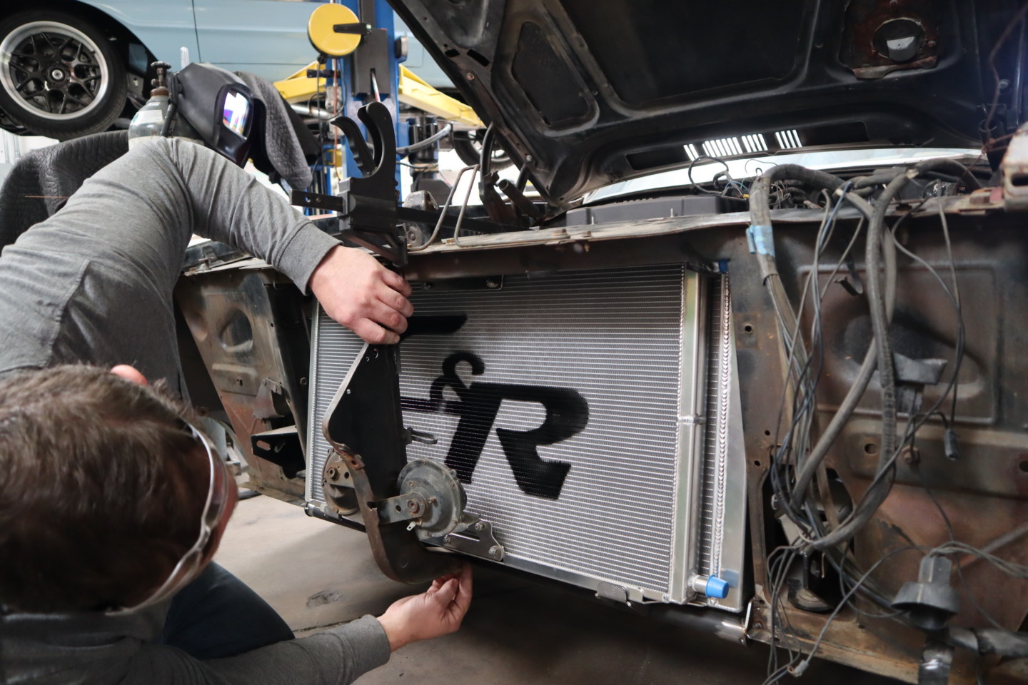 The heat exchanger (for the supercharger) will be mounted in front of the radiator. Eventually, there will be an A/C condenser there that mounts in front of the heat exchanger and mounts a third fan to push air through the heat exchanger. The Funkhouser dudes left plenty of room for all of the gear to live later on down the road.