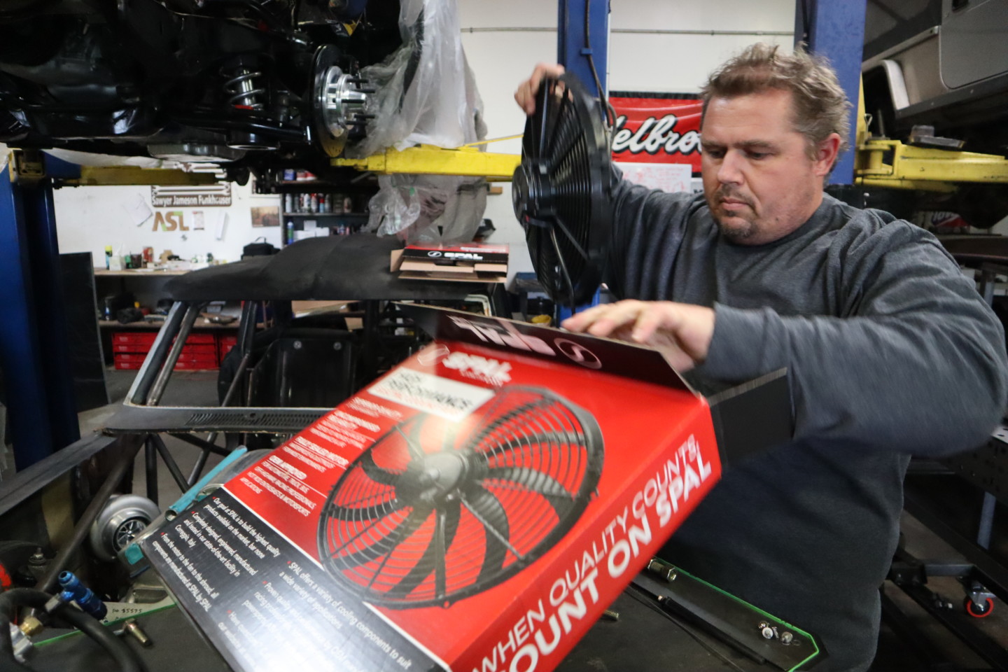 We wanted electric cooling fans for efficiency and to eliminate unnecessary parasitic draw on our mighty LT4, so we called fan gurus SPAL, and added a pair of their sweet little twirlers to the backside of the radiator to pull air through.