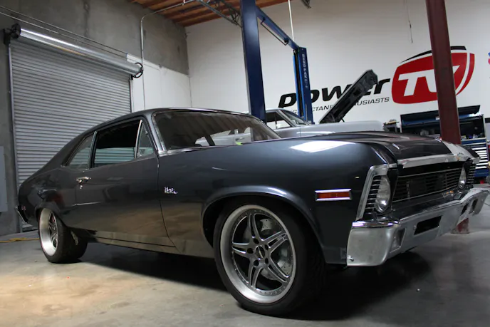 We installed Flowmaster’s U-Fit dual exhaust and while it was just what this Nova needed, it wasn’t exactly done, so we sent it out and had Jet-Hot give it their treatment. Flowmaster Super 44 mufflers were kept black, and the rest of the exhaust was hooked up and we finally got Swinger running under it’s own power to move it around in the shop.
