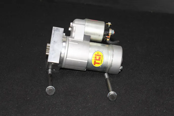When it came to getting the engine cranking over, we needed a starter that can handle a high performance engine, and one that could fit our odd combination of engine and trans. TCI Auto had just what we needed. The twelve adjustments that can be made to this high torque mini-starter allows for mounting in the tightest locations, allowing you the flexibility of clocking the starter body in any of several positions to clear other components. All that was needed was an allen wrench to remove three bolts, a slight rotation of the body, and replacing the bolts and tightening the starter to the mounting flange.