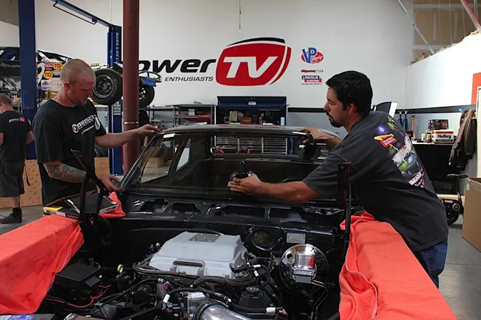 Helping us with the installation of the windshield glass (PN NR691T) and sealer (PN K4122) was Ruben from Lowest Price Auto Glass. The process of installing the front and rear windows, plus the rear trim molding took Ruben and Sean, our resident shop dawg, about an hour.