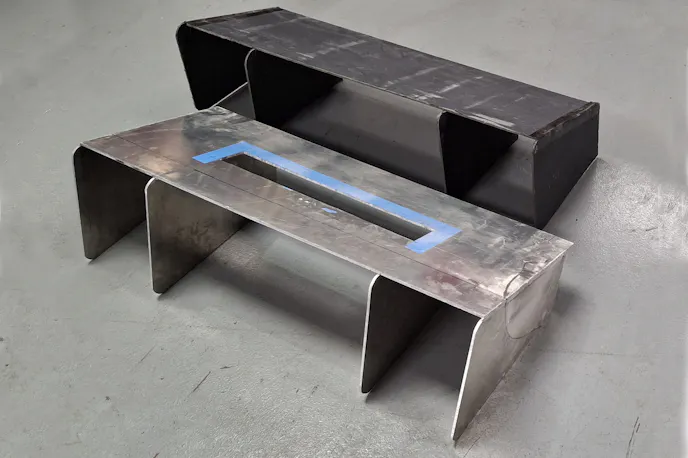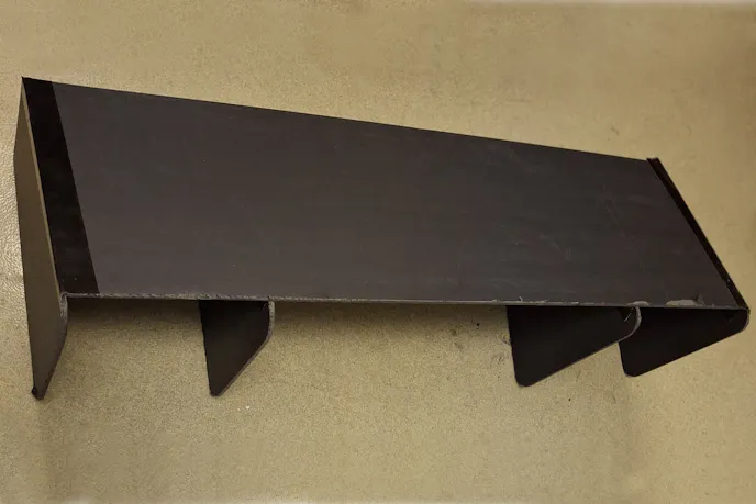 As it turned out, the TVR’s rear roll pan could be modified to accommodate a four-foot wide diffuser, with the outer strakes (fins) attaching to fiberglass supports molded into the factory pan. After clearing out the area a mock-up was built using 3/16-inch foamcore poster board. The inboard strakes were positioned to clear the mufflers. A trial fit confirmed the design.Then the model was disassembled and the pieces traced on a 3/16-inch sheet of aluminum. The five elements were cut out on a bandsaw, edges finished, and MIG welded into position.