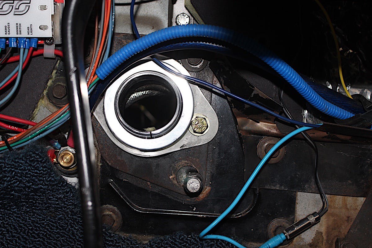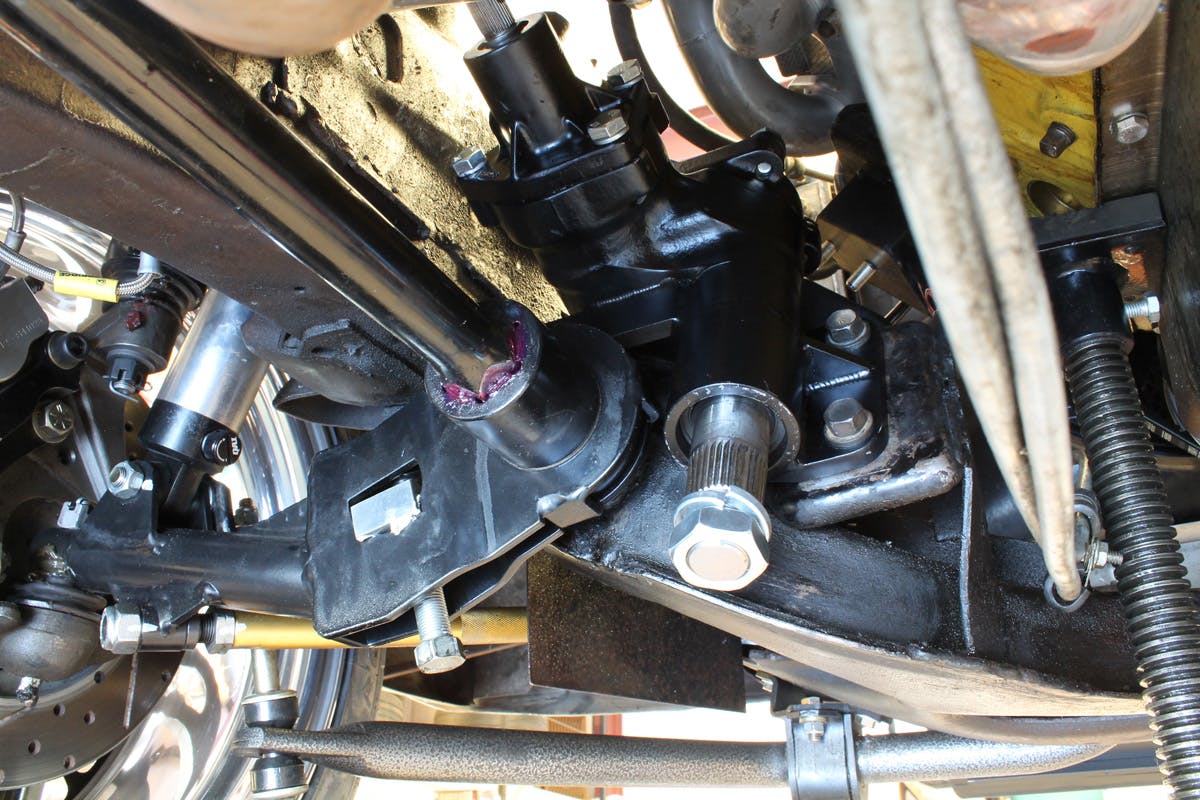 Moving up the chain of command, we tackled the steering shaft swap next. Here we used Flaming River’s 3/4-inch DD non-stainless steel shaft with a mill finish (PN FR1851), along with a 3/4-inch billet universal joint at the rack (PN FR1789P), a similar joint for the center of the shaft (PN FR1716DD), and a 3/4-inch support bearing kit with an angled bracket (PN FR1810KA) to allow for easy mounting of the support bearing. Any time you have more than two universal joints, you’ll need to have a support in the center to keep the steering shaft in place.