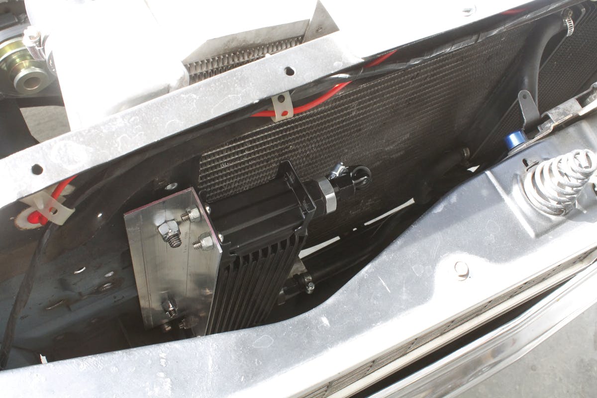 That’s exactly what we did here. For this application, we chose a 10-row Derale stack plate cooler (PN 51006) for the job, which helps lower reservoir temperatures up to 8 degrees. These aluminum heat exchangers can also be used for engine or transmission cooling and feature a 20,000 BTU rating.