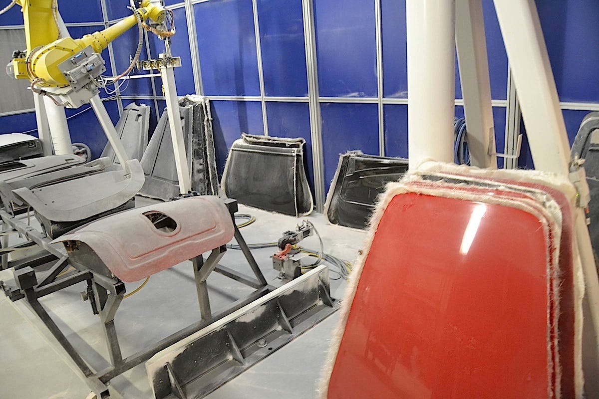 There are typically four or five people working on the body panels and many of the panels have three layers of fiberglass. To add strength where needed, as many as five layers of fiberglass is used on the molds. Each panel is laid separately, and when the panel is ready for trimming a robot is used to cut each panel out.