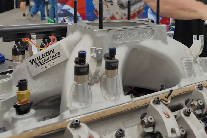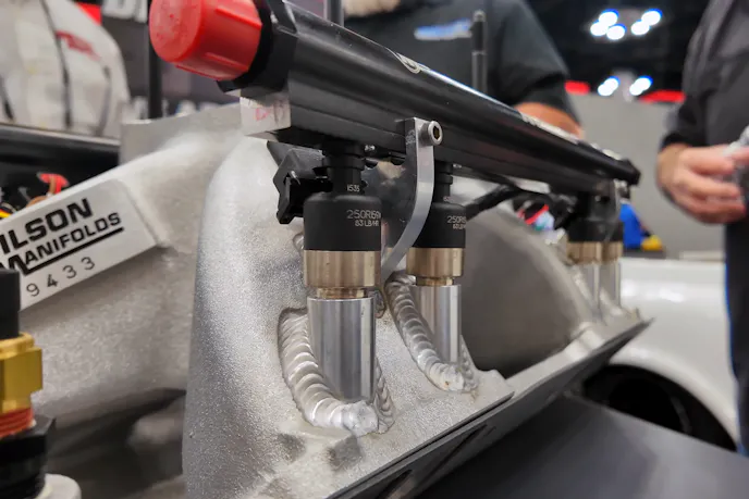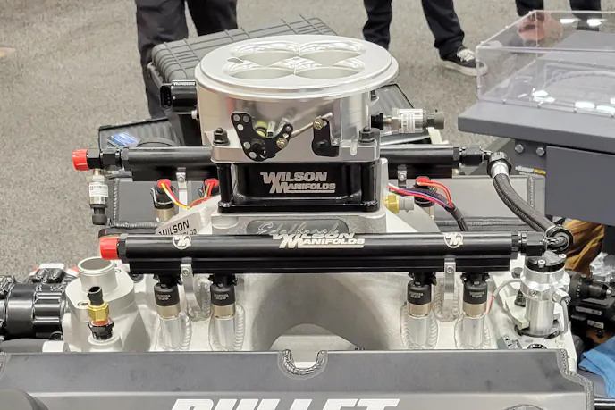 Naturally aspirated airflow leaves no room for mistakes. The team started with a Super Victor II manifold, port-matched it to the DR-17 heads, and converted it for EFI with Wilson Manifolds. Fuel is delivered by 83 lb/hr injectors controlled by a Holley Dominator ECU, paired with a coil-near-plug Smart Coil ignition. A 2,000-cfm 4500-flange Holley throttle body sits atop a Wilson spacer for added plenum volume. The result is carb-style airflow with EFI precision, street-ready but deep-tunable for the track.