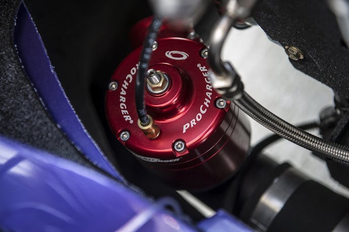 After the normally aspirated baseline, we installed the Kenne Bell supercharger. Off came the stock intake and (manual) throttle body and on went the lower intake, injectors, and finally the polished 2.8L supercharger. Also present was the Mammoth intake, bypass valve, and FAST 90-mm throttle body. We selected a set of 60-pound injectors to ensure adequate fuel delivery, and the supercharger was set up with a 3.75-inch blower pulley that resulted in a peak boost pressure of 9.9 psi at 6,500 rpm. Thanks to plenty of belt wrap, the new 6-rib drive assembly ran flawlessly during testing. Nothing is more frustrating than belt slippage, but this system produced a dead repeatable boost curve run after run.