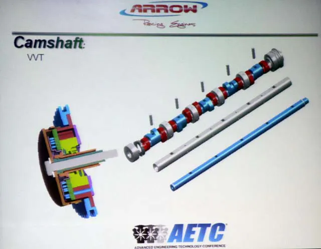 Lee Carducci AETC 06The Viper achieves variable valve timing by using a camshaft within a camshaft. That means there is a hollow shaft with the exhaust lobes attached. Within it is another shaft with the intake lobes pinned to it. By using a phaser the Viper engine can move the intake centerline relative to the exhaust to help make a very broad, very flat torque curve. Carducci says movement is around 80 degrees.