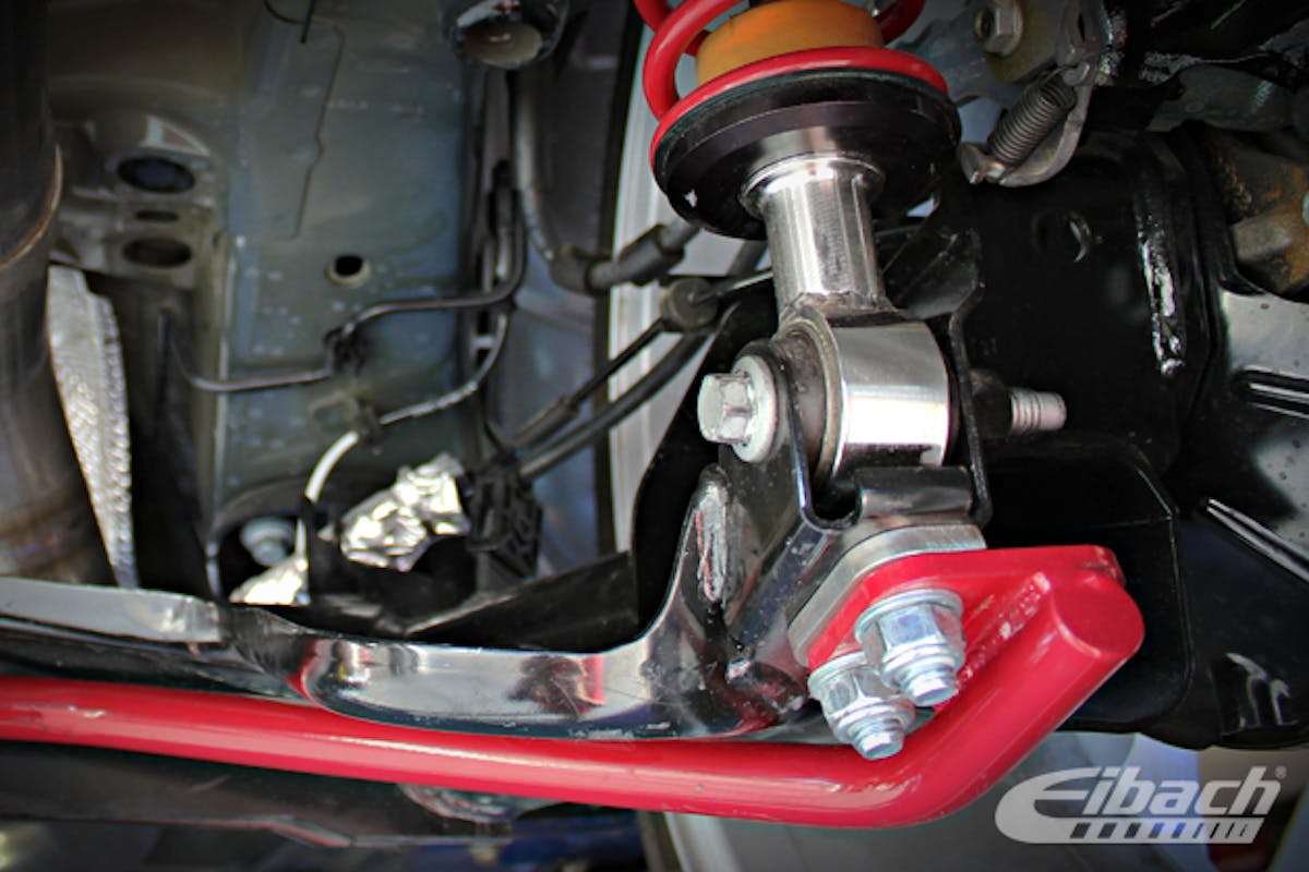 Simply put, a sway bar is a torsional spring that connects to both the left and right sides of the suspension to reduce body roll, as Oliver Rathlein of Eibach explained, “The sway bar links both sides of the suspension system to help reduce body roll when cornering. When both wheels take a bump equally, the wheels move the same amount without twisting the anti-roll bar. Individual wheel movement or body roll will force the bar to twist as the lever arms are moved, thereby adding the bar’s own spring rate to that of the car’s springs. Although an anti-roll bar’s main function is to reduce body roll in cornering, it also influences overall handling. You can fine-tune Over- or Understeering with them.”