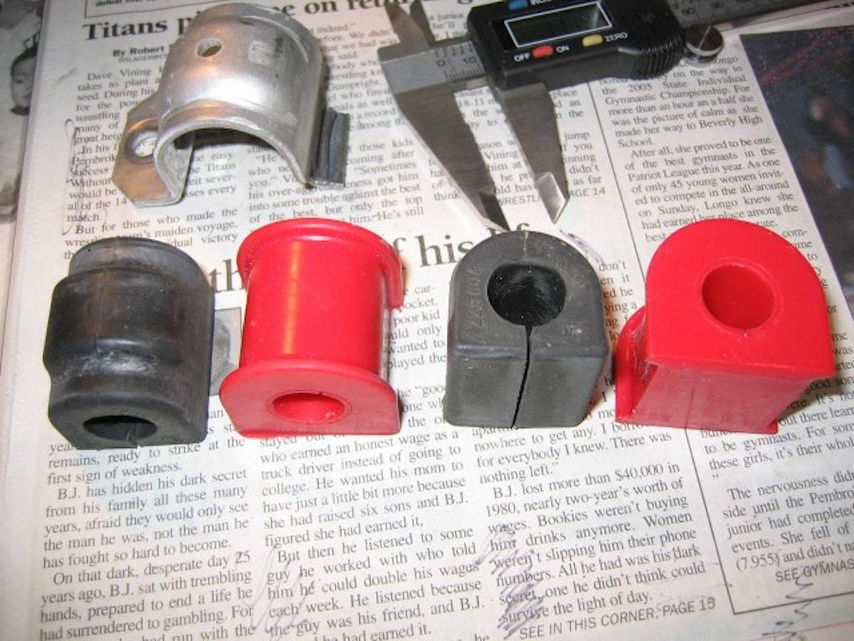 Popular replacements for factory rubberized bushings are polyurethane bushings. Polyurethane is much more durable than rubber, it doesn’t dry out because of its hydrophobic properties, and the sway bar won’t deflect as much as it would if it was mounted with rubber bushings. Knaus explained, “In our testing we find about a 20-percent loss of rate in our polyurethane bushings.”