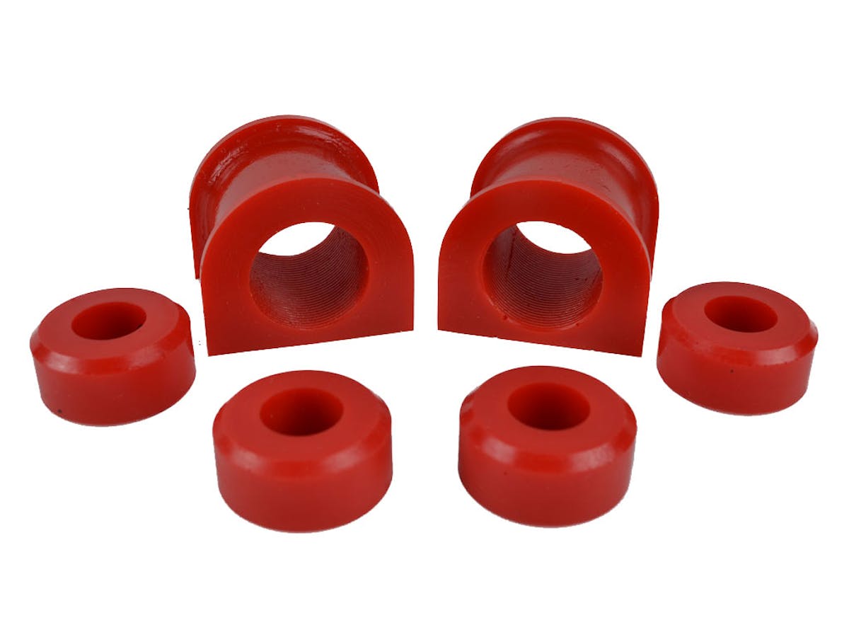 Popular replacements for factory rubberized bushings are polyurethane bushings. Polyurethane is much more durable than rubber, it doesn’t dry out because of its hydrophobic properties, and the sway bar won’t deflect as much as it would if it was mounted with rubber bushings. Knaus explained, “In our testing we find about a 20-percent loss of rate in our polyurethane bushings.”
