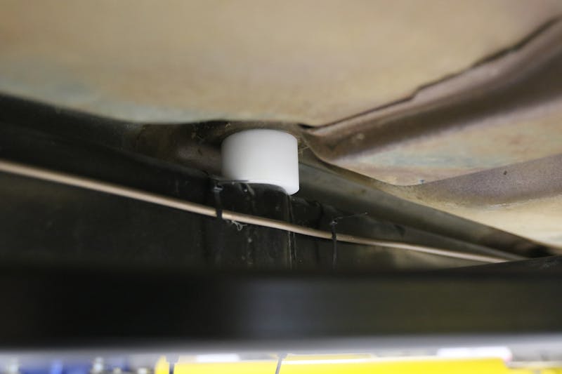 In just a few weeks, QA1 shipped out a 3.2-inch diameter carbon fiber driveshaft and it was up to IPT to make it fit in our very tight tunnel. Keep in mind, the factory driveshaft was smaller in diameter and the frame probably did not sit quite as close to the floorboard. When installing the Schwartz chassis, we custom-made the body mounts out of Delrin and cut them to size. The reason for doing this is that 50-plus years and many hard miles bring the metal out of shape, and the only way to make it truly level is to adjust the thickness of the body mounts. It also gives you the advantage of tucking the frame up further under the body, but of course that affects drivetrain clearance and possibly the driveline angle as well.