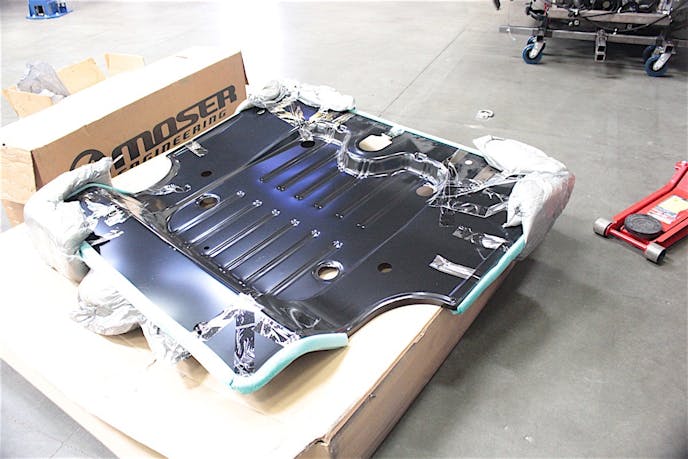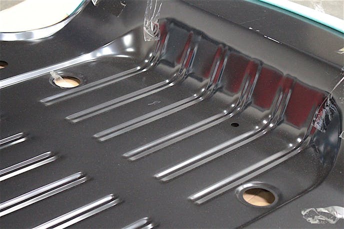 We looked around for a replacement pan, and of course the only place we could find it in stock was at Classic Industries (PN MM1090). Other sources showed a national back order, so reaching out to Classic Industries and finding this rear pan saved us a lot of time searching. The full pan arrived and we were able to replace the center section of the trunk floor with fresh new sheetmetal.