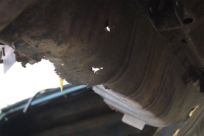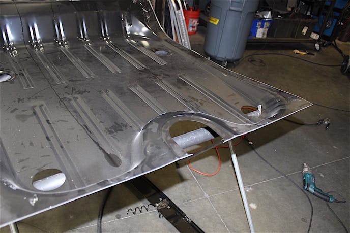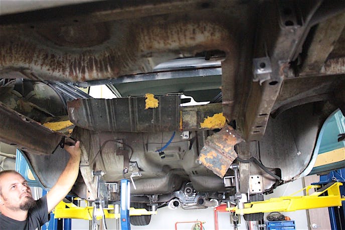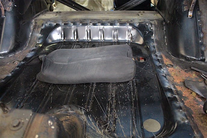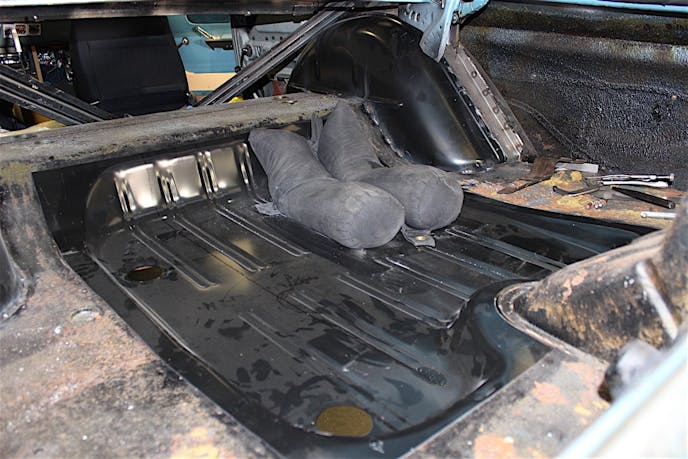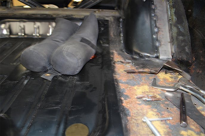 We were going to do some work on our 1965 Plymouth Belvedere II –like narrowing the rearend and mini tubbing the car – but soon after getting into the job, we found that it was a good idea to replace our trunk floor while we had the car stripped down. The Swiss cheese panel above our fuel tank was getting thin from decades of rain and standing water, and the rear pan was in bad shape.