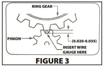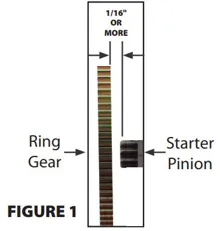Check Pinion Gear Mesh: Gear mesh is the relationship between the ring gear and the pinion gear teeth. There should be .020-.035 of area (the size of a paperclip) between the gear teeth when engaged. If the clearance is too tight, shims can easily be added between the engine block and starter mounting block.