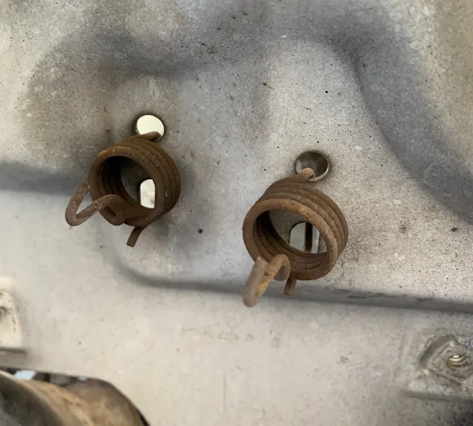 These are the original headlight bucket adjustment springs. I replaced them with new units from Classic Industries. I had to cut a hole in the original radiator support to make room for the new single headlight setup. I attached the bucket, springs, and adjustment screws to a custom fabricated plate attached to the radiator support. A link to an instructional video is provided below.