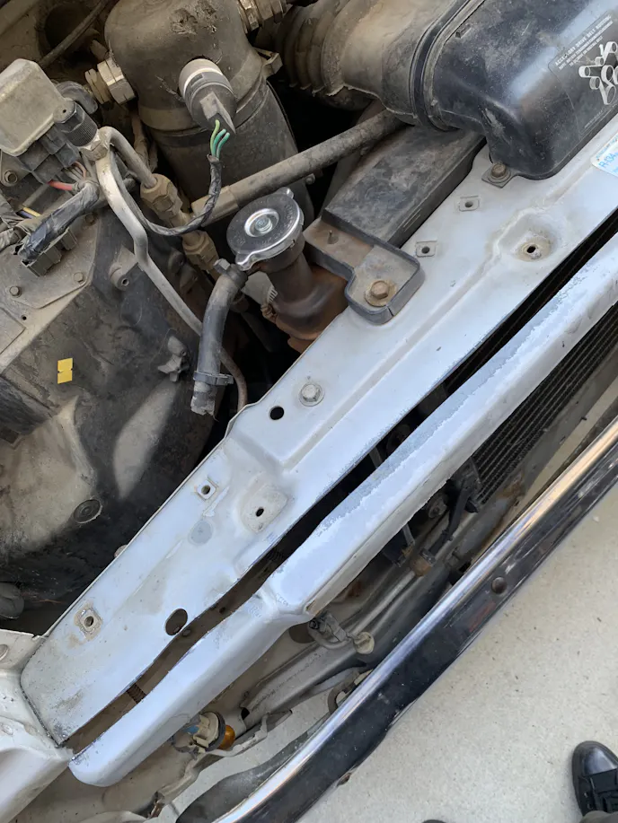 In order to make the new grill fit flush with the fenders and hood, there was some gentle "massaging" with a hammer on the lower corner pieces of the radiator support.
