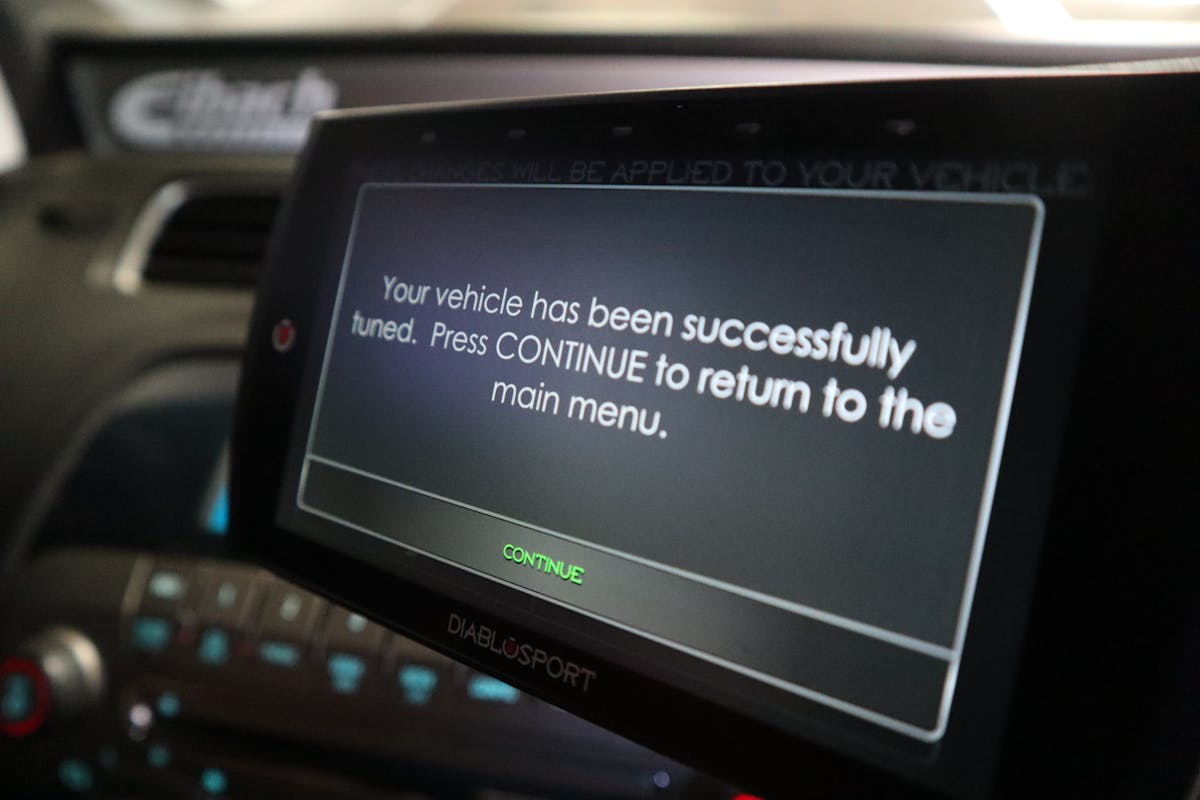 The Trinity 2 tuner does come with a pretty handy suction cup mounting system. We’re sure it’s made to attach to the front windscreen, but as the visibility from the cockpit of a 5th Gen Camaro is already notoriously narrow, we elected to attach it to the radios display. From there, we simply plugged the tuner into the Camaro’s obd11 port. Once plugged in, the system prompted us to cycle the car’s acc key switch and download the factory tune as a backup, in the event we want to put things back to stock. We then proceeded to upload our new tune optimized for 87 octane fuel. This was one of the concessions we made to adhere to California’s stringent emissions standards. Diablo sport does offer a tuner that’s optimized for 91 octane, but that was off the table for us.