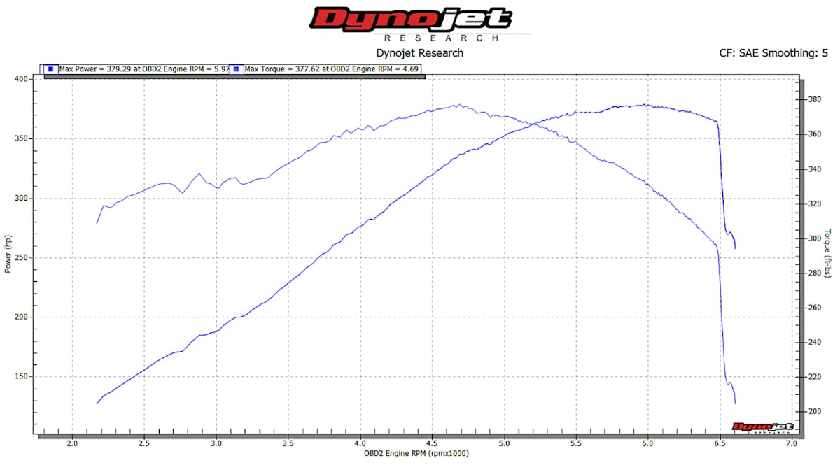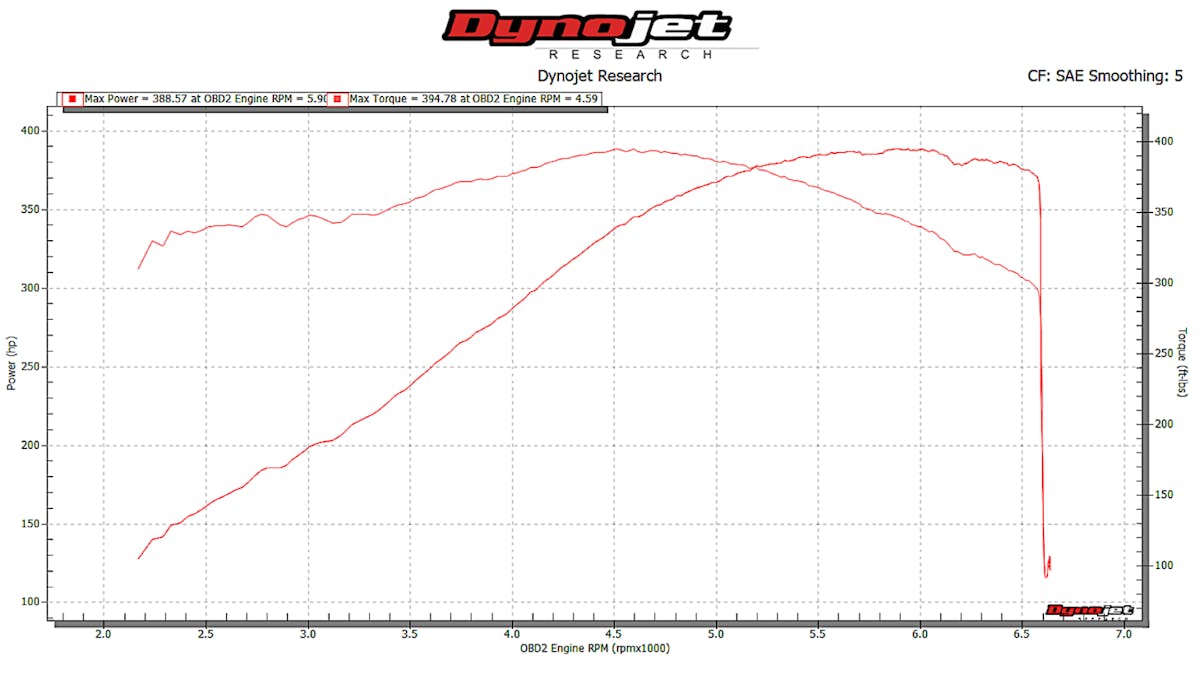 It’s when we look at the torque metrics that things get really interesting. Our baseline dyno graph indicates our maximum torque output was 377.72 ft-lb at 4,690 RPM. After our modifications, that figure jumped up to 394.78 ft-lb at 4,590 RPM. That’s an increase of 17.06 ft-lb of torque! What’s more, is the fact that the torque curve is much more linear and comes in much earlier near the 3,500 RPM mark.